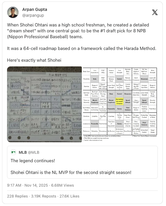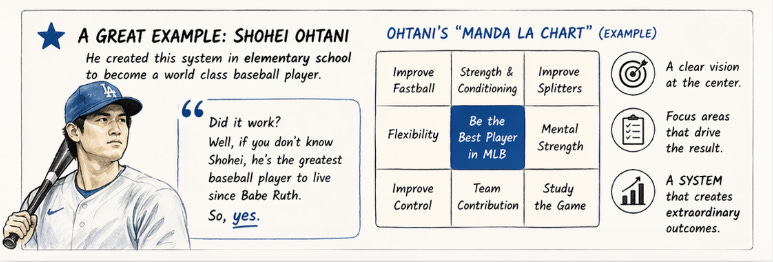 One of my favorite examples of a great system is Shohei Ohtani’s that he created in elementary school to become a world class baseball player. Did it work? Well, if you don’t know Shohei, he’s the greatest baseball player to live since Babe Ruth. So, yes. Check out the X link below